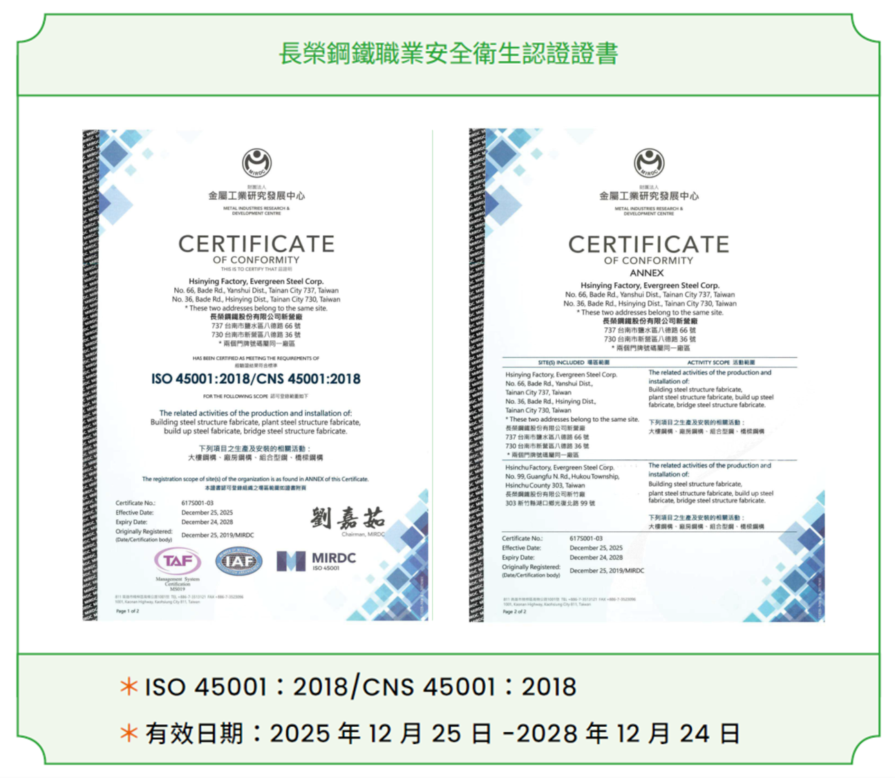 長榮鋼鐵秉持保障員工安全與健康的使命,已建立職業安全衛生管理系統,系統涵蓋長榮鋼鐵股份有限公司新營廠、長榮鋼鐵股份有限公司新竹廠及所屬工地作業活動之工作者,並於2015年通過OHSAS 18001 & CNS 15506 職業安全衛生管理系統驗證,2019年完成 OHSAS 18001 轉換 ISO 45001 & CNS 45001之驗證作業,透過每年內、外部稽核各一次,以確認管理系統落實性與有效性,並不斷利用系統 PDCA 運作,提升安全衛生績效,為員工營造安全、健康之友善工作環境。