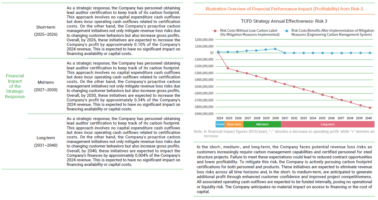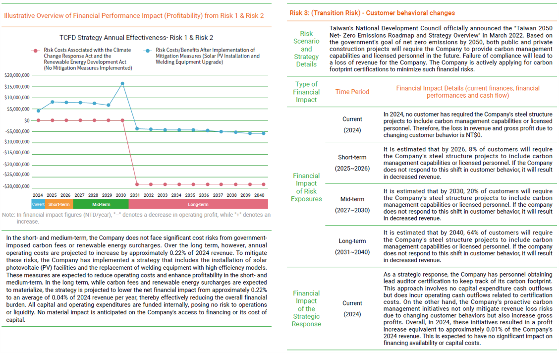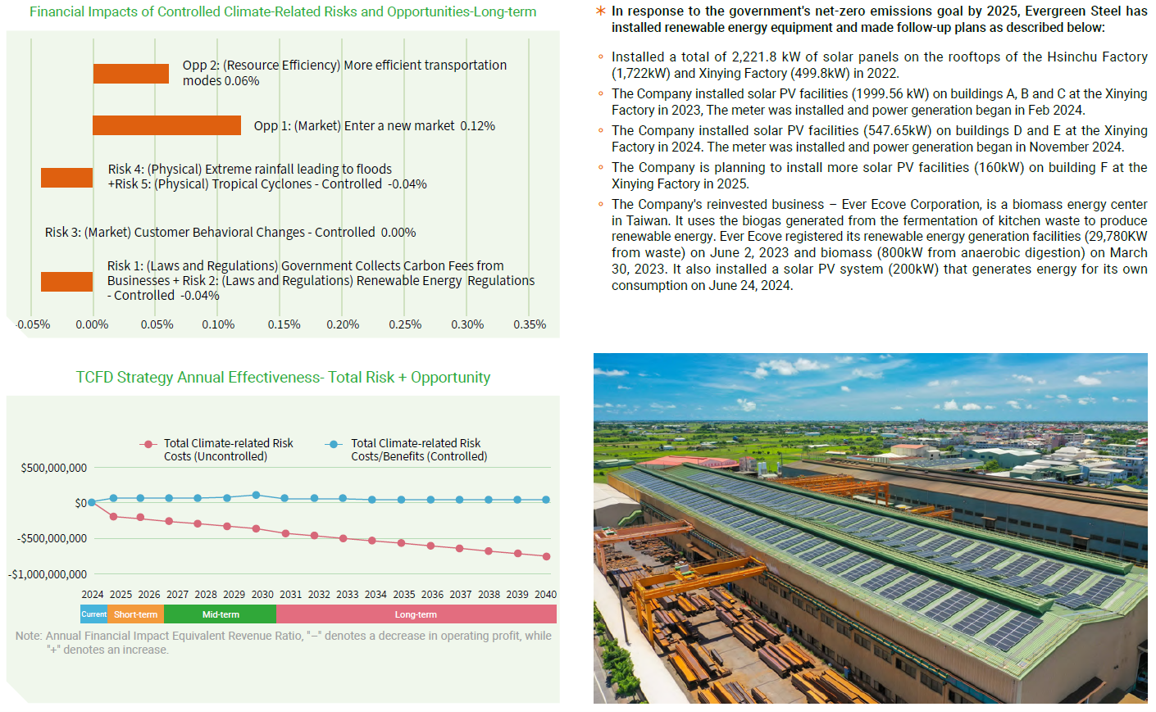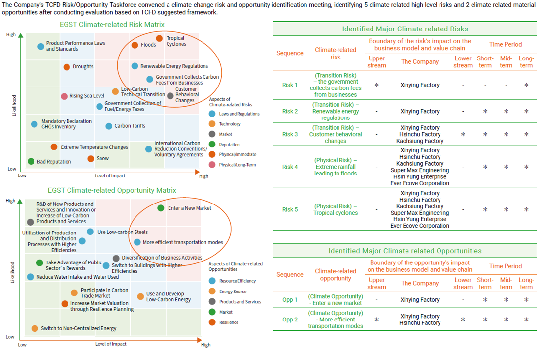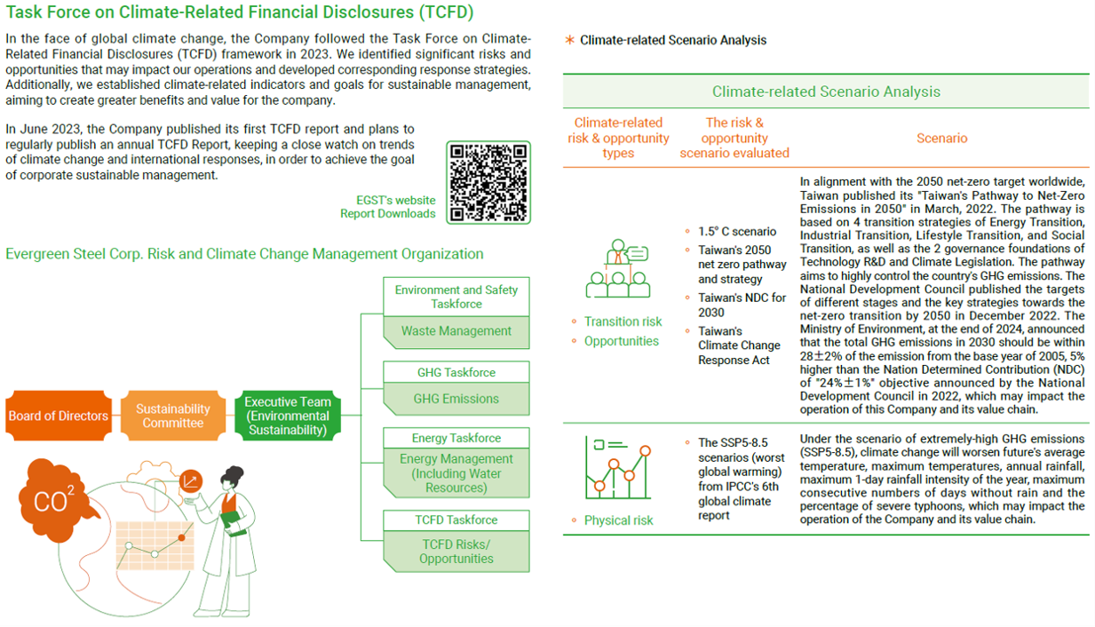 In making policy, the company is guided by reports issued by the TCFD (Task Force on Climate-Related Financial Disclosures) under the Financial Stability Board (FSB). "Recommendations of the Task Force on Climate-related Financial Disclosures (TCFD) " has four core elements: Governance, Strategy, Risk Management, and Metrics and Targets, upon which the TCFD framework is based. The TCFD framework evaluates major climate-related risks and opportunities on business operations and proposes solutions. It has also formulated climate-related metrics and targets that can be managed sustainably. In April 2022, Evergreen Steel Corp. signed on to become a supporter of TCFD. In June 2023, Evergreen Steel published its first "TCFD Report", and its third " TCFD Report " in June 2025.