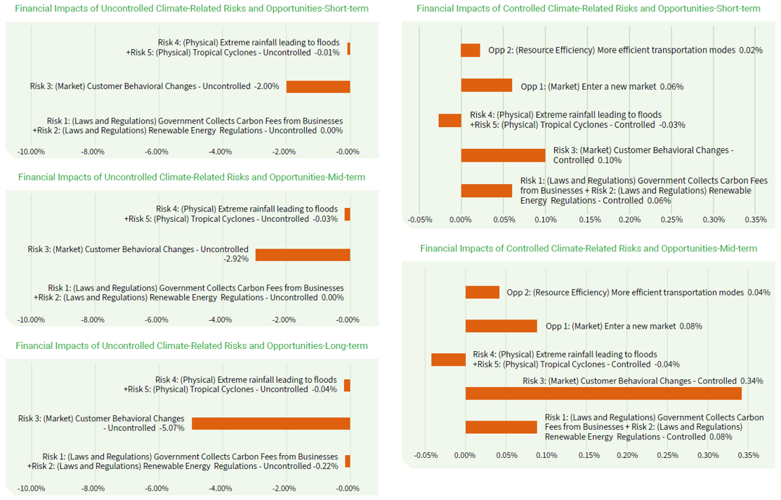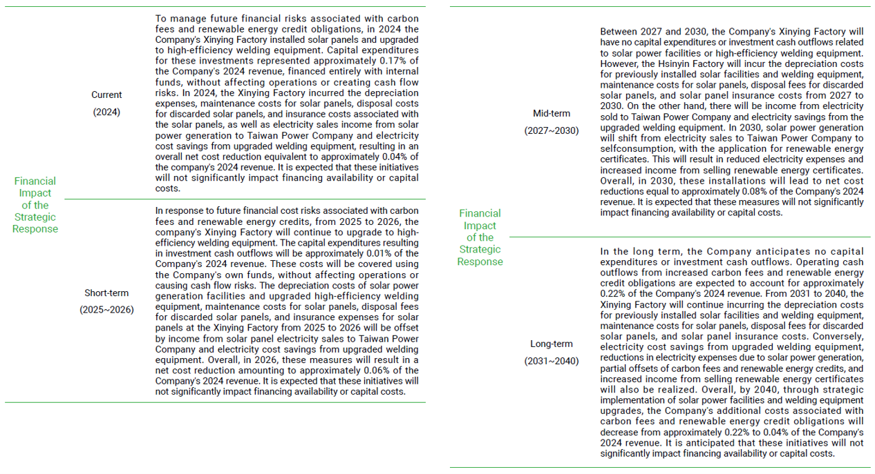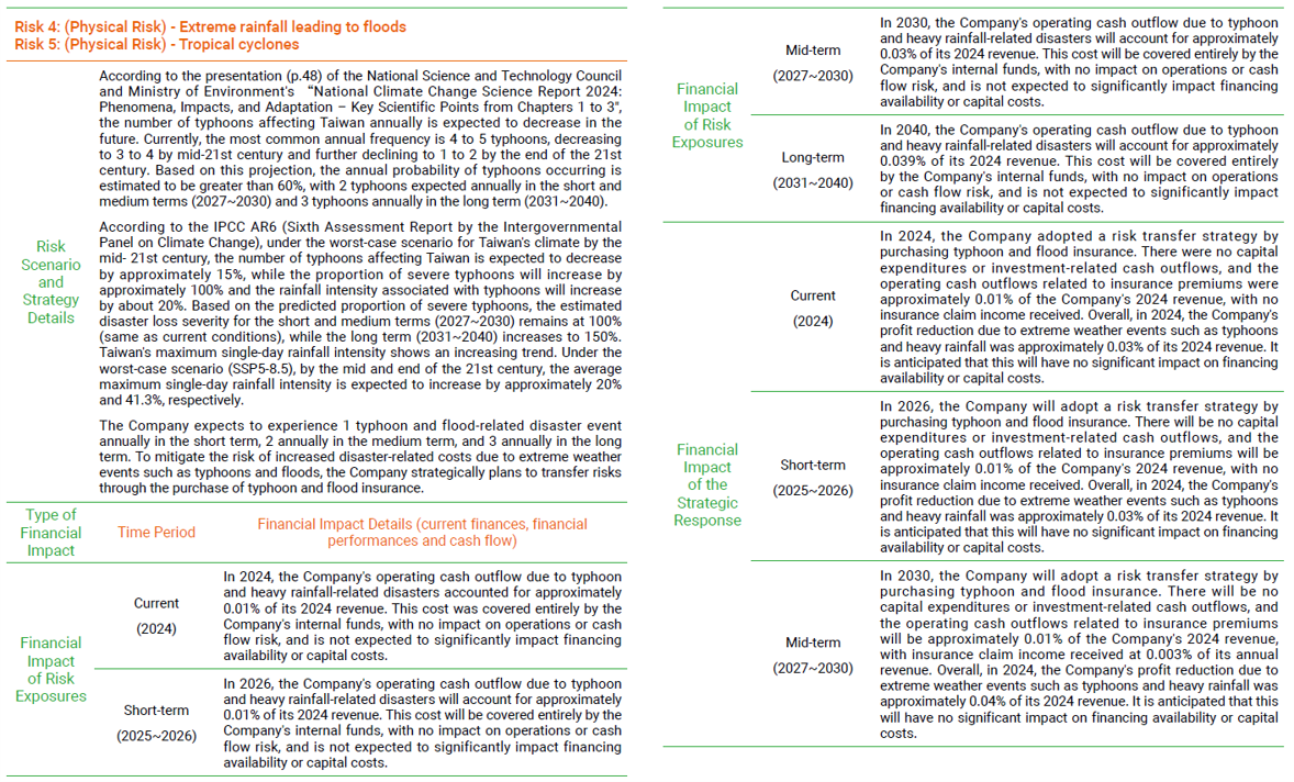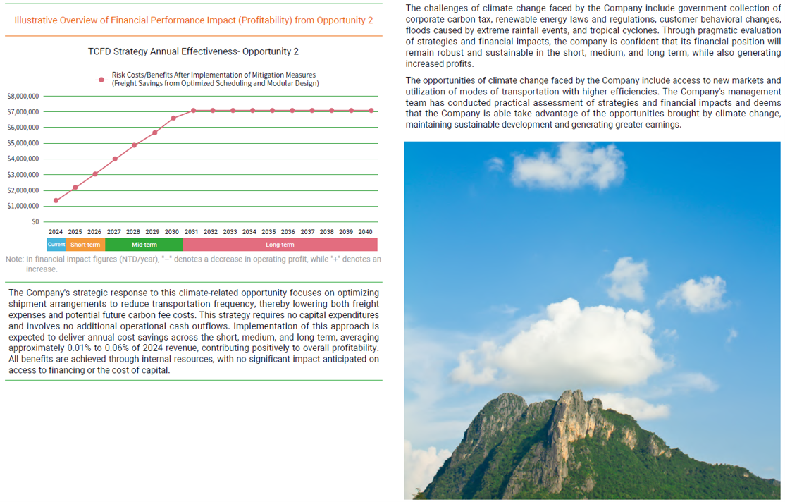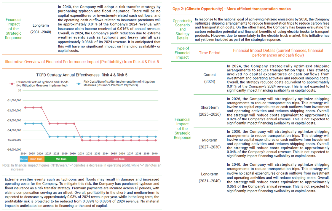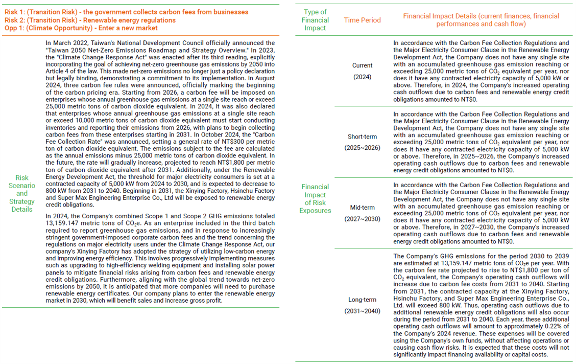 The Company's Board of Directors is responsible for supervising the implementation plan and effectiveness of climate change strategy, and established the Sustainability Committee. The TCFD team of the Environmental Sustainability Group under the Sustainability Committee is composed of personnel assigned by relevant departments to promote and implement climate change-related issues and introduce risk management, and effectively establish a management mechanism through risk identification, risk evaluation, risk response, and risk monitoring. The Sustainability Committee holds at least 2 meetings annually and reports relevant implementation results to the Board of Directors. The Sustainability Committee has reported relevant implementation results of 2024 to the Board of Directors on December 26, 2024.