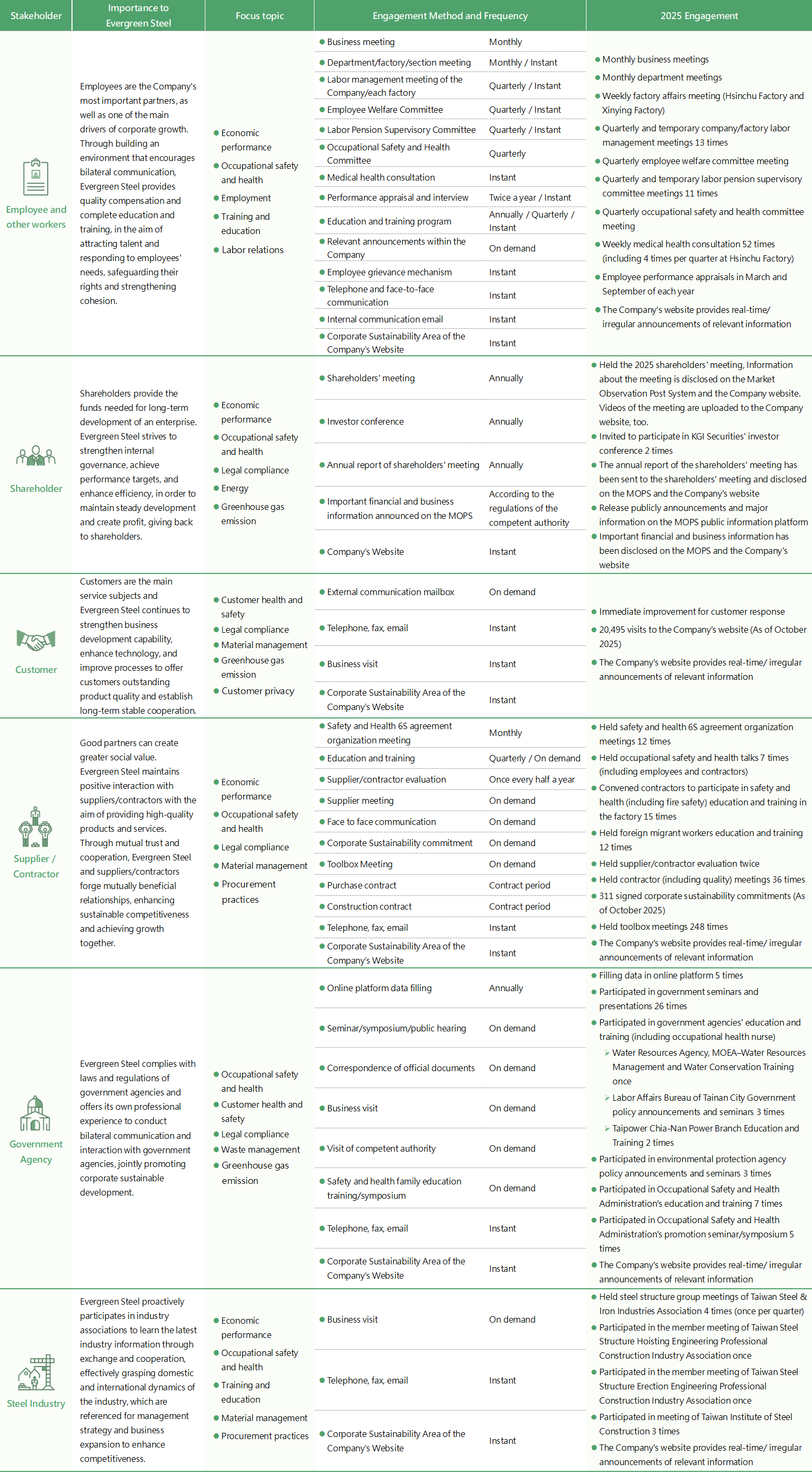 Evergreen Steel referred to the five principles of the AA1000 Stakeholder Engagement Standard (AA1000 SES, 2015)—Dependency, Responsibility, Tension, Influence, and Diverse Perspectives—to identify and prioritize groups or organizations that have a significant impact on, or are affected by, the Company. Through joint discussions among senior executives, members of the Sustainability Committee task force, and external experts, six stakeholder categories were identified as the Company’s key stakeholders and priority communication targets: employees and other workers, shareholders, customers, suppliers/contractors, government agencies, and steel industry peers.